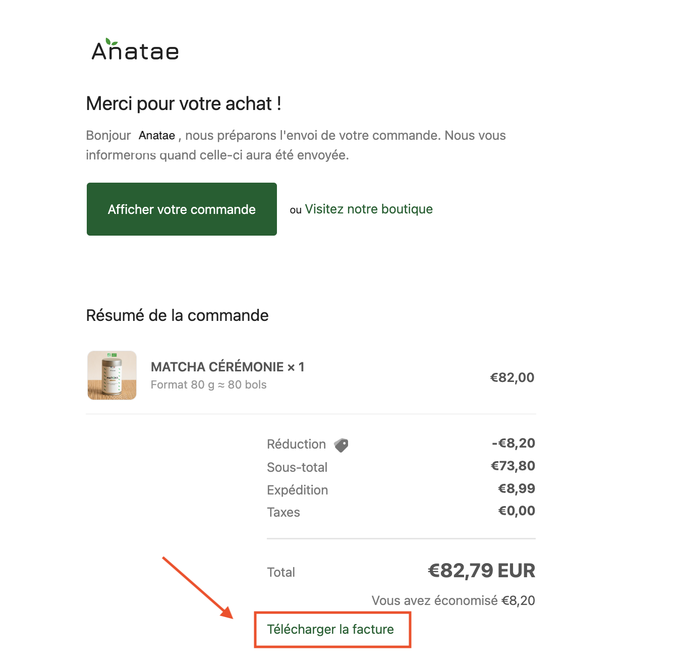 La facture liée à votre commande dans le mail de confirmation, vous aurez un bouton vous permettant de la télécharger :